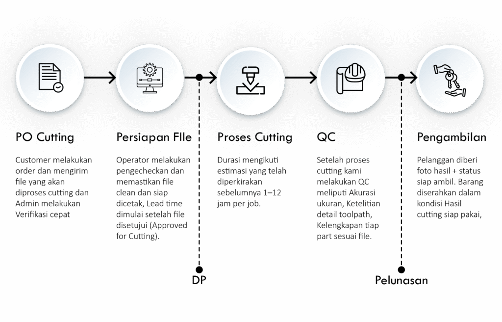 Layanan cutting merupakan Layanan pemotongan material sampai tembus mengikuti pola yang telah di desain sebelumnya, digunakan ketika hasil akhir yang dibutuhkan adalah potongan lepas seperti panel dekor, fasad, partisi, huruf timbul, atau bentuk custom lainnya.